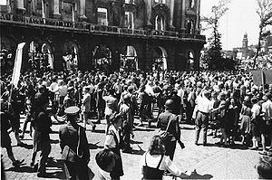 In der Münchner Marienstraße wartet am 20. Juni 1948 eine Menschenmenge auf die Ausgabe der neuen Währung. (Bayerische Staatsbibliothek, Bildarchiv fruh-00117)