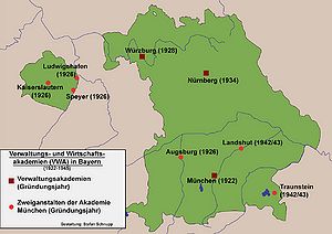 Die Akademie München errichtete schon 1926 Zweiganstalten in Augsburg und in der Pfalz (Kaiserslautern, Ludwigshafen, Speyer); 1942/43 entstanden ferner Zweiganstalten in Traunstein und Landshut. Eigenständige Verwaltungsakademien waren 1928 in Würzburg und 1934 in Nürnberg geschaffen worden.