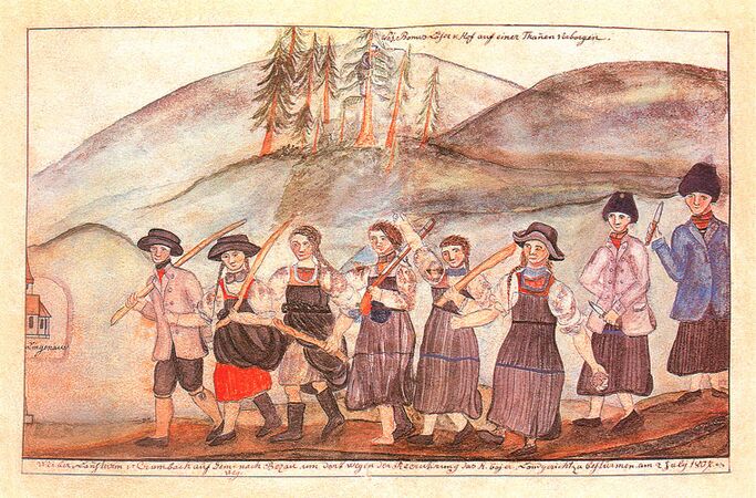 1807 verhinderten Frauen im Bregenzerwald mit Gewalt die Musterung der wehrpflichtigen jungen Männer. Sog. "Weiberaufstand von Krumbach", Darstellung in der Pfarrchronik von Lingenau. (Vorarlberger Landesarchiv)