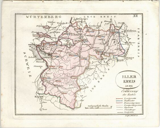 Die sieben Vorarlberger Landgerichte wurden dem 1808 eingerichteten Illerkreis (Verwaltungssitz: Kempten) zugewiesen. Karte von Joseph Schleich (1791-1851) aus dem Jahr 1809. (Bayerische Staatsbibliothek -- Mapp. XI,50 o-12)