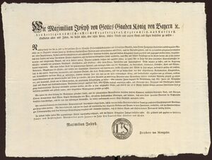 Noch vor dem Jahreswechsel rückte eine kleine bayerische Truppe in Bregenz ein, am 19. Januar 1806 huldigte eine Delegation der Vorarlberger Stände dem bayerischen König Maximilian I. Joseph (1752-1825, Kurfürst von Pfalzbayern 1799-1806, König von Bayern 1806-1825), bat aber auch um den Schutz der althergebrachten Verfassung und die Förderung der Wirtschaft, insbesondere der Textilindustrie. Die formelle Übergabe vollzogen am 13. März 1806 in Bregenz ein französischen Kommissär, der Direktor bei der Landesdirektion in Schwaben Maximilian von Merz (1758-1811) für Bayern sowie der scheidende Kreishauptmann und Landvogt Franz von Vintler (1768-1807).