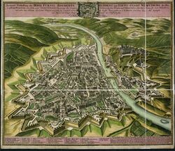 Stadtansicht Würzburgs mit der Festung Marienberg von 1632/33. Erstmals erschienen im Würzburger Wappenkalender für das Jahr 1634 vermutlich von Johann Leypold (1579-1642). Überarbeitet und abgedruckt 1648 in Matthäus Merian d. Ä. (1593-1653), Topographia Franconiae, Frankfurt 1648, n 62. (Staats- und Stadtbibliothek Augsburg, 4 K-K 117)
