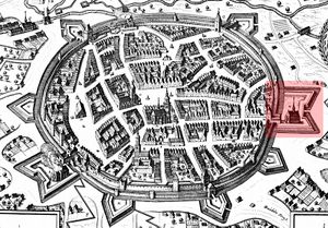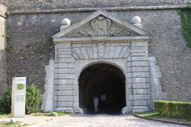 Eingang zur "Teufelsschanze" (Foto 2018), ein detachiertes Fort (Redoute), das über einen unterirdischen Gang von der Bastion "St. Sebastian" aus erreicht werden konnte. Ca. 1719-1726 von Balthasar Neumann nach Vorlagen von Maximilian Welsch errichtet. (Foto von Wolfgang lizenziert durch CC BY-NC-SA 3.0 DE via Wikimedia Commons)