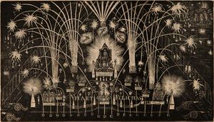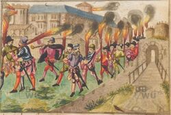 Miniatur der Ganzhornchronik signiert "M. H. W. 1593": Eine Militärparade mit brennenden Strohfackeln um die Burg an Fasching zum Gedenken an einen Sieg gegen die Bürger 1308: Die Teilnehmer des Umzugs bezeichnen das mutmaßliche Schlachtfeld. Dies befand sich im Garten, denn sie laufen entlang einer Mauer mit Brüstung. Diese stieß offenbar rechtwinklig auf das Gartentor und endete dort. Dahinter sind erneut die zwei Türme des Vorhofs zu sehen, beide besser profiliert. Auch an der Hauptburg sind mehr Details zu erkennen. (Ganzhornchronik StAWü, HV MS. f. 857a, 397, lizenziert durch CC BY-NC-ND 4.0)
