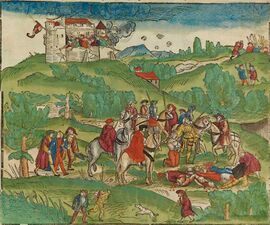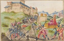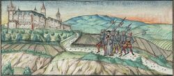 Entsatz der belagerten Festung Marienberg durch den Schwäbischen Bund am 8. Juni 1525. Zeitgenössischer, kolorierter Holzschnitt aus dem Contrfect[us] Etlicher Krigshandlvng (sog. "Bamberger Burgenbuch"), 1523-1527. (Staatsbibliothek Bamberg, RB.H.bell.f.1, fol.68 (Detail), lizenziert durch CC BY-SA 4.0)