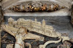 Epitaph des Bischofs Melchior Zobel im Würzburger Dom ca. 1558 von Peter Dell d. J. Der Ausschnitt den Tod des Bischofs nach tödlicher Verwundung am Burgaufgang: Im Burgprospekt ist der Anschluss des Donjon an den Ostflügel sowie der Ausbau des Saales im Nordosteck mit Fensterbögen und Oculi vollzogen. Der Wedturm ist bis auf einen Stumpf abgetragen. Vor dem Eingangstor ist ist im Nordwesten das „lange Haus“ oder Bauernstube zu sehen. Stark vergrößert ist der Lustgarten, an dessen Außenmauer der Bischof stürzte und starb. Er besaß zwei Zugangstore, ein unteres und ein oberes, das zur Burg führte, daneben das 1651 beseitigte „mitlern garten rondel“. (Institut für Kunstgeschichte, Universität Würzburg)