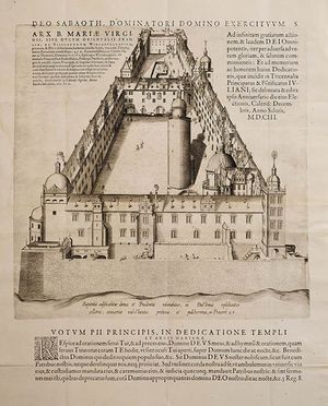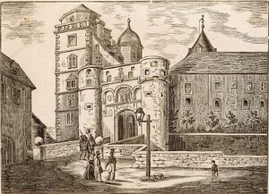 Miniatur der Echterschen Frieschronik aus Irmelshausen von Georg Mack ab 1582: Die Gefangennahme des Domherrn Friedrich Schoder von 1437: Die Miniatur ist deutlich nach 1582 entstanden, denn der Umbau der Schlosses durch Echter ist bereits abgeschlossen. Neue Turmspitzen und Zwerchgiebel sind allenthalben entstanden. Der 1607 eingeweihte Gabriels- bzw. Kiliansturm ist vollendet, damit auch die schon 1605 errichtete Echterbastei des Vorhofs. Vom Garten ist nur das äußere Tor erkennbar. (Echtersche Frieschronik der Universitätsbibliothek Würzburg, M.ch.f.760, 879, lizenziert durch CC BY-NC-ND 4.0)