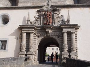 Die Innenseite des Neutors der Festung Marienberg, 2014. Als "Monumentum Pacis" feiert es die Friedensschlüsse von Westfalen 1648 unter Johann Philipp von Schönborn. Figurenschmuck von Zacharias Juncker d. Ä. (ca. 1578-1665) von 1653. (Foto von Wini lizenziert durch CC BY-SA 3.0 DE via Wikimedia Commons)