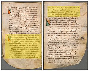 Notitia eines Kaufgeschäfts (farbl. hervorgehoben): Ein gewisser Lantfrid verkaufte vier Parzellen Wald zu Zell bei Assling an den Freisinger Vogt Sindeo, der im Auftrag von Bischof Hitto von Freising (reg. 811-835) den Wald gegen ein Pferd erwarb. Abb. aus dem Cozroh-Codex, 9. Jh. (Quellenedition) (Bayerisches Hauptstaatsarchiv, HL Freising 3a lizensiert durch CC BY-NC-SA 4.0)