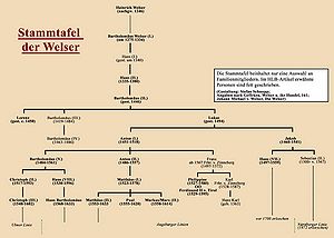 Stammtafel der Welser. Vereinfachte Darstellung mit wichtigen Familienmitgliedern. Im Text erwähnte Personen sind fett gedruckt. (Gestaltung: Stefan Schnupp, Angaben nach: Johann Michael von Welser, Die Welser, Nürnberg 1917; Peter Geffcken, Die Welser und ihr Handel, in: Häberlein/Burkhardt, Die Welser, 161)