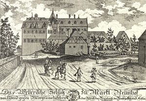 Das Welserschloss in Neunhof (Lkr. Nürnberger Land). Stich von Georg Daniel Heumann (1691-1759), um 1740. Abb. aus: Hugo Barbeck: Alt-Nürnberg. Kulturgeschichtliche Bilder aus Nürnbergs Vergangenheit, Bd. 9: Die Nürnbergische Landschaft, Nürnberg 1896, Blatt 10. (Bayerische Staatsbibliothek, 2 Bavar. 32 v-6/10)