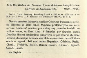 Eine Notiz aus Passau hielt 1038 fest, "dass der Diakon O. seinen Eigenmann A. zum Heil seiner Seele dem Altar des heiligen Stephan auf die Weise übertrug, dass jener Mann [A.] in jedem Jahr fünf Pfennige an die Brüder zahlen müsse, die dort dem Heiligen dienen [Domkapitel], er aber selbst vor allen weiteren Diensten sicher sei und leben könne, wo auch immer er wolle, ohne dass dem widersprochen werde" (Tr. Passau 119).