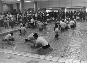Taufe der Zeugen Jehovas in der Olympia-Schwimmhalle während ihres Kongresses "Göttlicher Sieg" im Olympiastadion, 1973. (Stadtarchiv München, DE-1992-FS-ERG-F-0004)