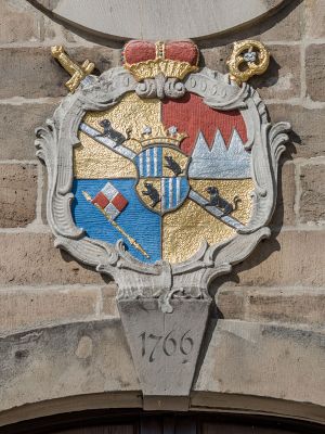 Das Wappen von Fürstbischof Johann Gottfried von Guttenberg (reg. 1684-1698) über dem Hauptportal von Stift Haug. (Foto von Wolfgang lizensiert durch CC BY-SA 3.0 via WürzburgWiki)