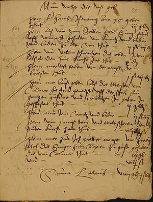 Auflistung der Ausgaben der Kolmarer Gesellschaft u. a. im Zusammenhang mit einer zu Weihnachten abgehaltenen Singschule. (Stadtarchiv Freiburg, Aktenbestand C1 Meistersinger 1 Nr. 6, Bl. 20r)