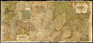 "...die Mappa uber das Ampt Rhieneck...": Der Ausschnitt aus der Spessartkarte von Elias Hoffmann aus dem Jahre 1584 zeigt das Gebiet der vormaligen Grafschaft Rieneck, die nach 1559 die mainzischen Ämter Lohr und Rieneck bildeten. (Hessisches Staatsarchiv Marburg A 11)