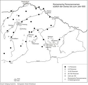 Diese Beispiele althochdeutschen Lautwandels des späten 7. und 8. Jahrhunderts deuten auf ein längeres Nebeneinander von romanischer und bairischer Sprache hin. Dafür spricht auch die über nahezu das gesamte Gebiet der Raetia Secunda und des westlichen Noricum, wenn auch in sehr unterschiedlichen Quantitäten, ausgebreitete Verteilung dieser Altnamen (Karte 1), wobei die Belegkonzentration in den Episkopalsitzen Freising, Regensburg, Passau und vor allem im von vorgermanischen Toponymen umgebenen Iuvavum-Salzburg gewiss auch deren zentrale Funktionen widerspiegelt. Was die chronologische Dimension der romanischen Personennamen angeht, scheint die Situation im 8. Jahrhundert zugunsten des 'germanischen' Namenbrauchs zu kippen. Eine so hohe Anzahl romanischer Namen wie in der ersten in Freising ausgestellten Urkunde von 743 findet sich später nicht mehr. Ebenso bleibt die erste, ins frühe 8. Jahrhundert zu datierende Passauer Urkunde mit ihrer Ausstellung in vico Fonalvae die consule und ihren völlig romanischen Agenten Mairanus, Dominicus, Dominicans, Floritus, Vigilus und dem Schreiber Quartinus, der auch ein qui escripsi mit romanischem Vokalvorschlag einflicht, singulär.