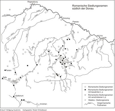 Östlich der Enns haben nur winzige romanische Sprachinseln – bis spätestens ins 7./8. Jahrhundert – überlebt: Tulln, 837 Tullina, bewahrt unverschobenes [t]; romanischer intervokalischer [g]-Schwund zeigt sich bei der Traisen (GwN beim Kastellort Traismauer, antik Tragisa(mum) < kelt. *Tragisamâ, 828 Dreisma) und beim Kaumberg, 791 Cumeoberg < *Comagenis (antiker Name der Stadt Tulln nach der dort stationierten Ala I Commagenorum). Immerhin zeigen all diese Befunde, dass sowohl die im späten 5. Jahrhundert von Severinus (gest. 482) vorgenommene Umsiedlung romanischer Bevölkerung der Raetia II nach Lauriacum/Lorch als auch die von Odoakar (König von Italien 476-493) 488 angeordnete Rückführung der Romani nach Italien keineswegs alle Anwohner der Donauprovinzen betroffen hat.