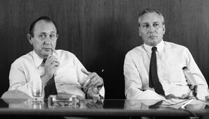 Historischer Knopfdruck. Verleger Hubert Burda (r.) und Chefredakteur Helmut ...
