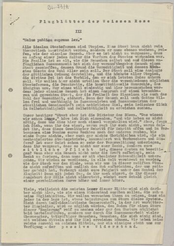 Besondere Bedeutung kommt dem zweiten Teil des Flugblattes zu. Hier wird die Perspektive der Ablehnung und des Widerstandes überschritten und erstmals die Konturen eines demokratischen und föderalistischen Deutschlands und Europas nach der Überwindung des Nationalsozialismus umrissen. Die 'Weisse Rose' strebte ein Deutschland an, das Teil einer solidarischen europäischen Staatenordnung werden soll: "Nur in großzügiger Zusammenarbeit der europäischen Völker kann der Boden geschaffen werden, auf dem ein neuer Aufbau möglich sein wird. Jede zentralistische Gewalt, wie sie der preußische Staat in Deutschland und Europa auszuüben versucht hat, muss im Keime erstickt werden. Das kommende Deutschland kann nur föderalistisch sein. (…) Die Arbeiterschaft muss durch einen vernünftigen Sozialismus aus ihrem Zustand niedrigster Sklaverei befreit werden. (…)  Jedes Volk, jeder einzelne hat ein Recht auf die Güter der Welt! Freiheit der Rede, Freiheit des Bekenntnisses, Schutz des einzelnen Bürgers vor der Willkür verbrecherischer Gewaltstaaten, das sind die Grundlagen des neuen Europa."