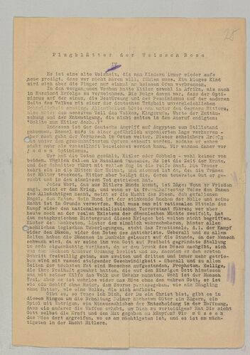 Die 'Weisse Rose' war eine Widerstandsgruppe in München. 1942 und 1943 klagte sie in sechs Flugblättern die Verbrechen des Nationalsozialismus an. Sie forderte die Bevölkerung auf, gegen die NS-Diktatur aufzubegehren und warb für ein demokratisch-föderalistisches Deutschland. Am 18. Februar 1943 wurden Hans (1918-1943) und Sophie Scholl (1921-1943) bei der Verteilung des sechsten Flugblattes an der Münchner Universität entdeckt und die Widerstandsgruppe zerschlagen. Sämtliche Mitglieder des inneren Kreises der 'Weissen Rose' wurden vor dem Volksgerichtshof zum Tode verurteilt und hingerichtet.