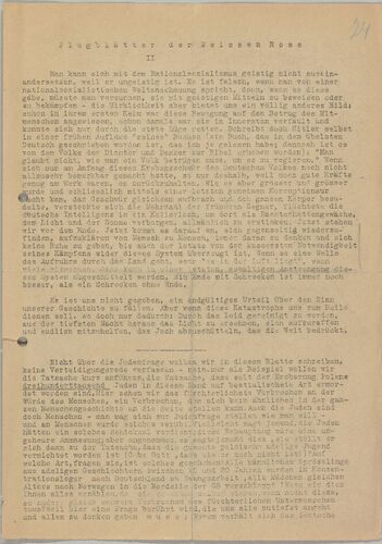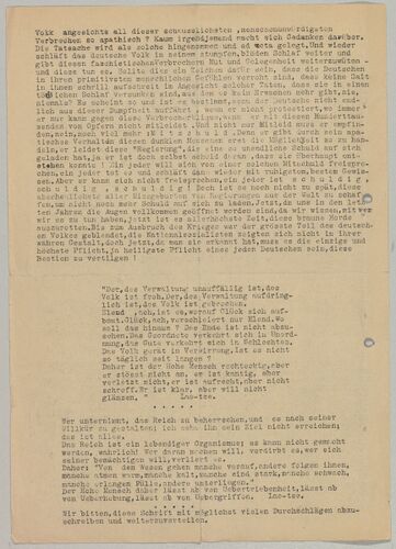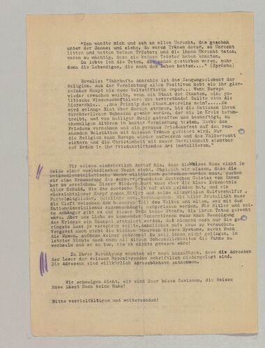 Urheber: Hans Scholl, Alexander Schmorell; Auflage: 10.000-12.000; Verbreitung: München, Augsburg, Salzburg, Wien, Linz, Stuttgart, Frankfurt am Main. (Bundesarchiv, R 3018/18431)