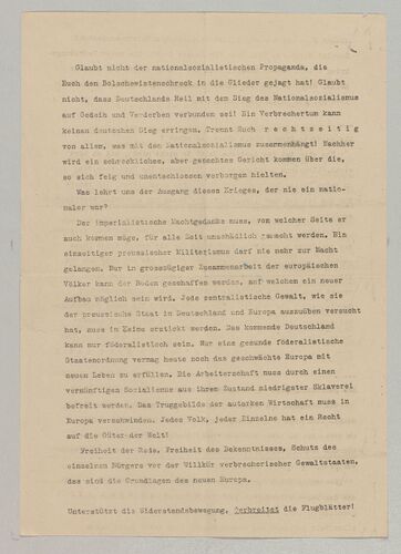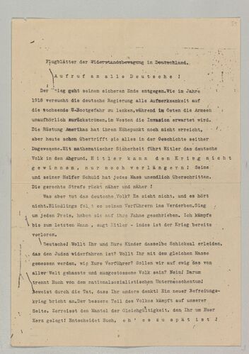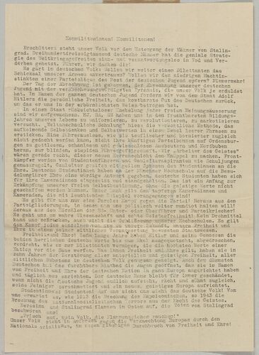 Urheber: Hans Scholl, Alexander Schmorell; Auflage: ca. 100; Verbreitung: München und Umgebung. (Bundesarchiv, R 3018/18431)