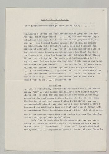 Inhalt des Entwurfs für ein siebtes Flugblatt der 'Weissen Rose' von Christoph Probst. (Bundesarchiv, R 3017/34635)