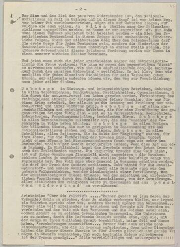 Der zweite auf Schmorell zurückgehende Teil des Flugblattes handelt von den Mitteln, das fest etablierte Unrechtssystem zu stürzen. Dies könne nicht durch Einzelne, sondern nur durch das gemeinsame Wirken zahlreicher Gesinnungsgenossen gelingen, und zwar durch Ausübung passiven Widerstands. Dieser müsse durch möglichst viele Menschen in allen nur erdenklichen Bereichen der Gesellschaft und in verschiedensten Formen geleistet werden.