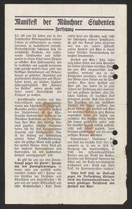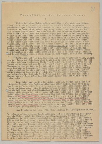 Die 'Weisse Rose' war eine Widerstandsgruppe in München. 1942 und 1943 klagte sie in sechs Flugblättern die Verbrechen des Nationalsozialismus an. Sie forderte die Bevölkerung auf, gegen die NS-Diktatur aufzubegehren und warb für ein demokratisch-föderalistisches Deutschland. Am 18. Februar 1943 wurden Hans (1918-1943) und Sophie Scholl (1921-1943) bei der Verteilung des sechsten Flugblattes an der Münchner Universität entdeckt und die Widerstandsgruppe zerschlagen. Sämtliche Mitglieder des inneren Kreises der 'Weissen Rose' wurden vor dem Volksgerichtshof zum Tode verurteilt und hingerichtet.