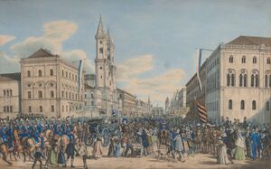 König Ludwig I., umgeben von Künstlern und Gelehrten, steigt ...