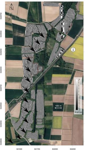 Nordteil des Karlsgrabens, SQUID-Magnetogramm mit Kanalverlauf, eingebettet in ein ...