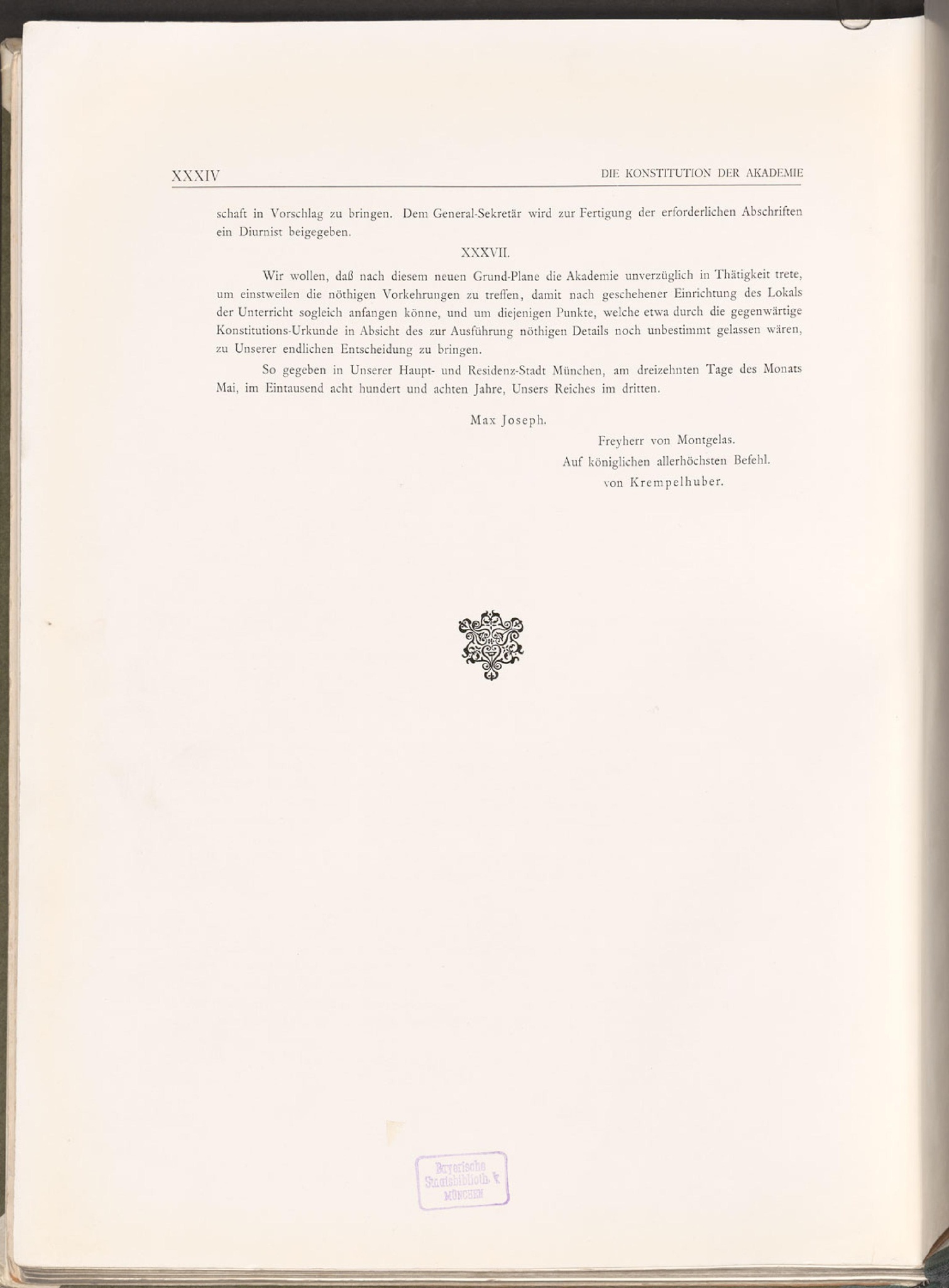 Konstitution der Akademie der Bildenden Künste in München von 1808. Auszug aus: Die Königliche Akademie der bildenden Künste zu München, Festschrift zur Hundertjahrfeier, München 1909, XXII-XXXIV. (Bayerische Staatsbibliothek, Res/2 Bavar. 812 s-1)