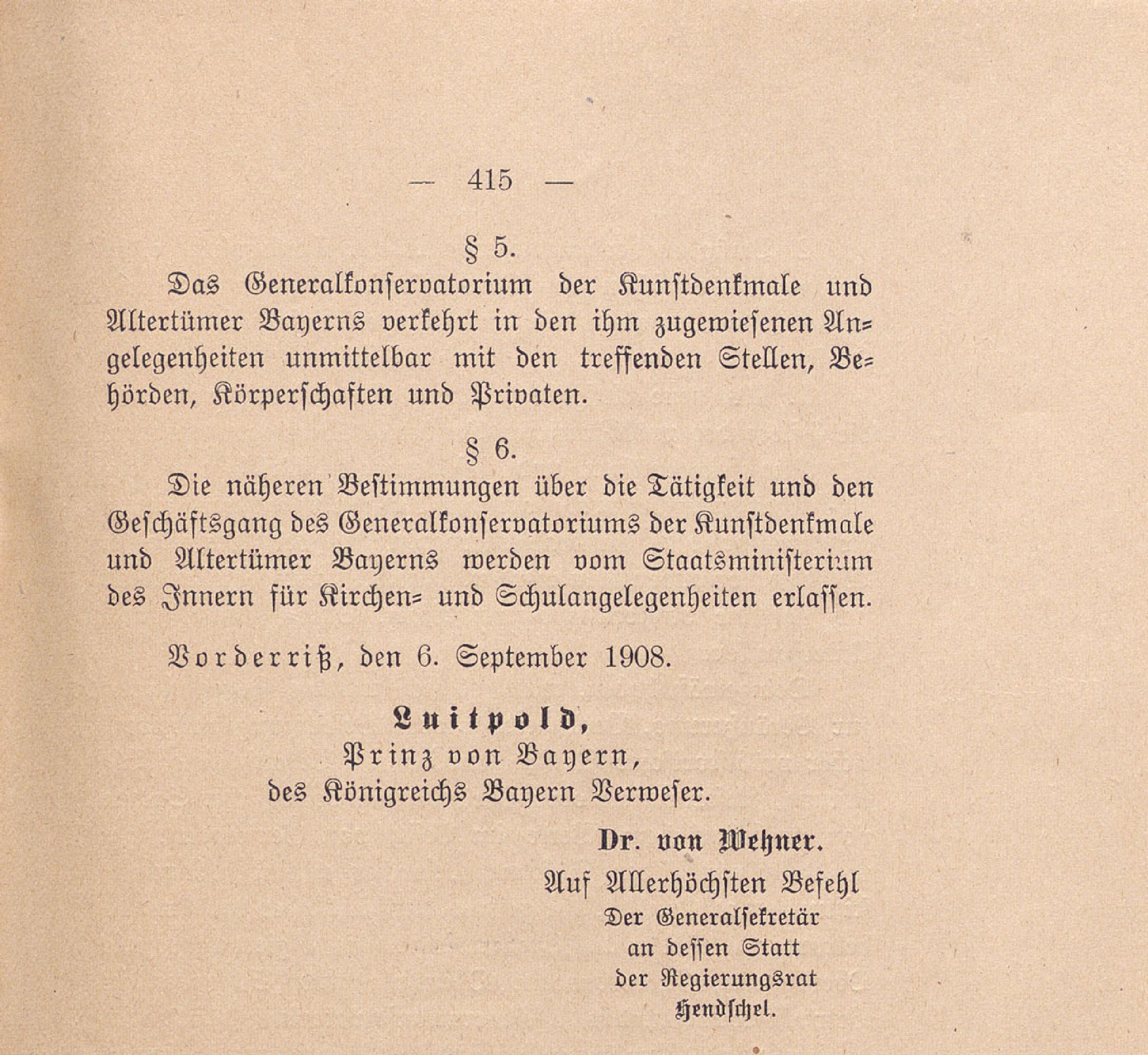 Königlich Allerhöchste Verordnung zur Einreichtung des Generalkonservatoriums der Kunstdenkmale und Altertümer Bayerns vom 6. September 1908. (Bayerisches Hauptstaatsarchiv MK 14426)