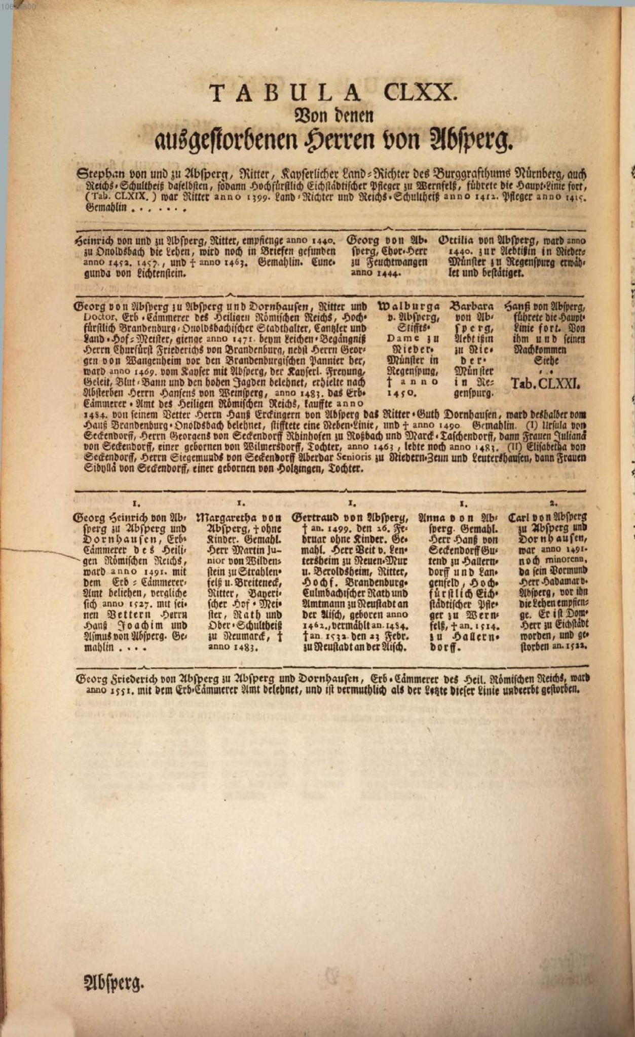 Stammtafel der Herren von Absberg, Auszug aus: Johann Gottfried Biedermann, Geschlechtsregister der reichsfrey unmittelbaren Ritterschaft Landes zu Francken löblichen Orts an der Altmühl, Bayreuth 1748 (Bayerische Staatsbibliothek, 2 Geneal. 28-2#Beibd.3 )
